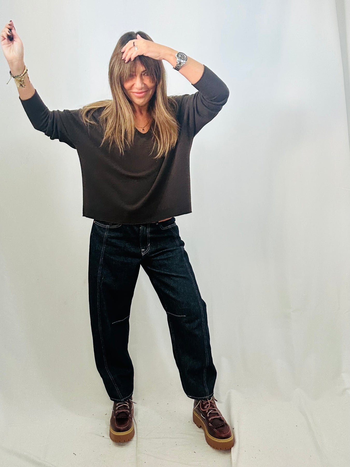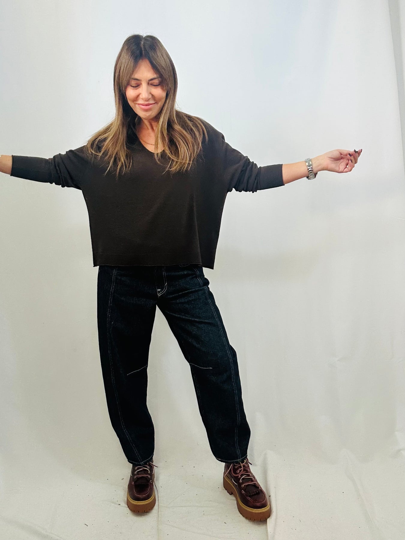 Gentle scoop v neck, long sleeves, relaxed fit, short length, fine ribbed hem and cuffs.