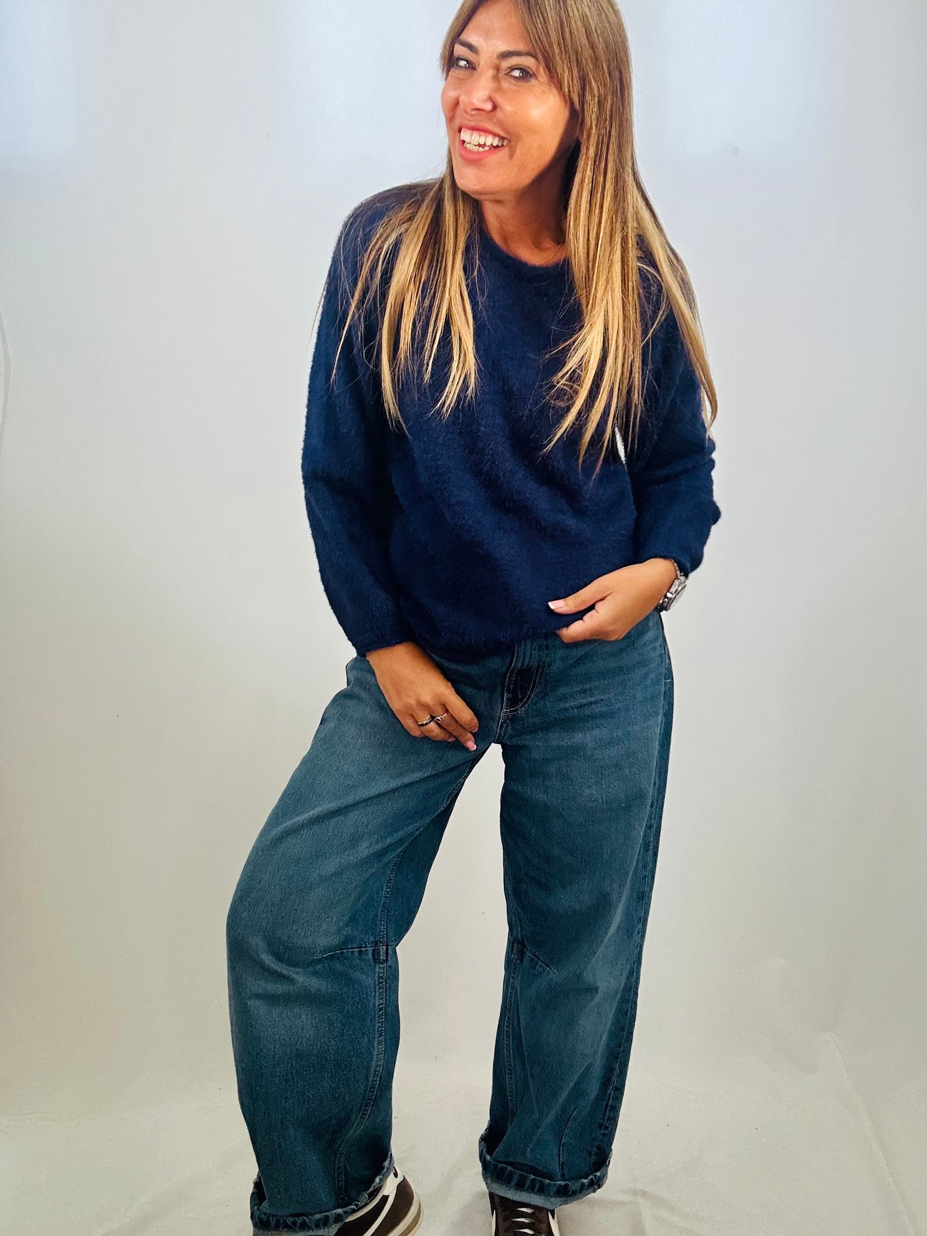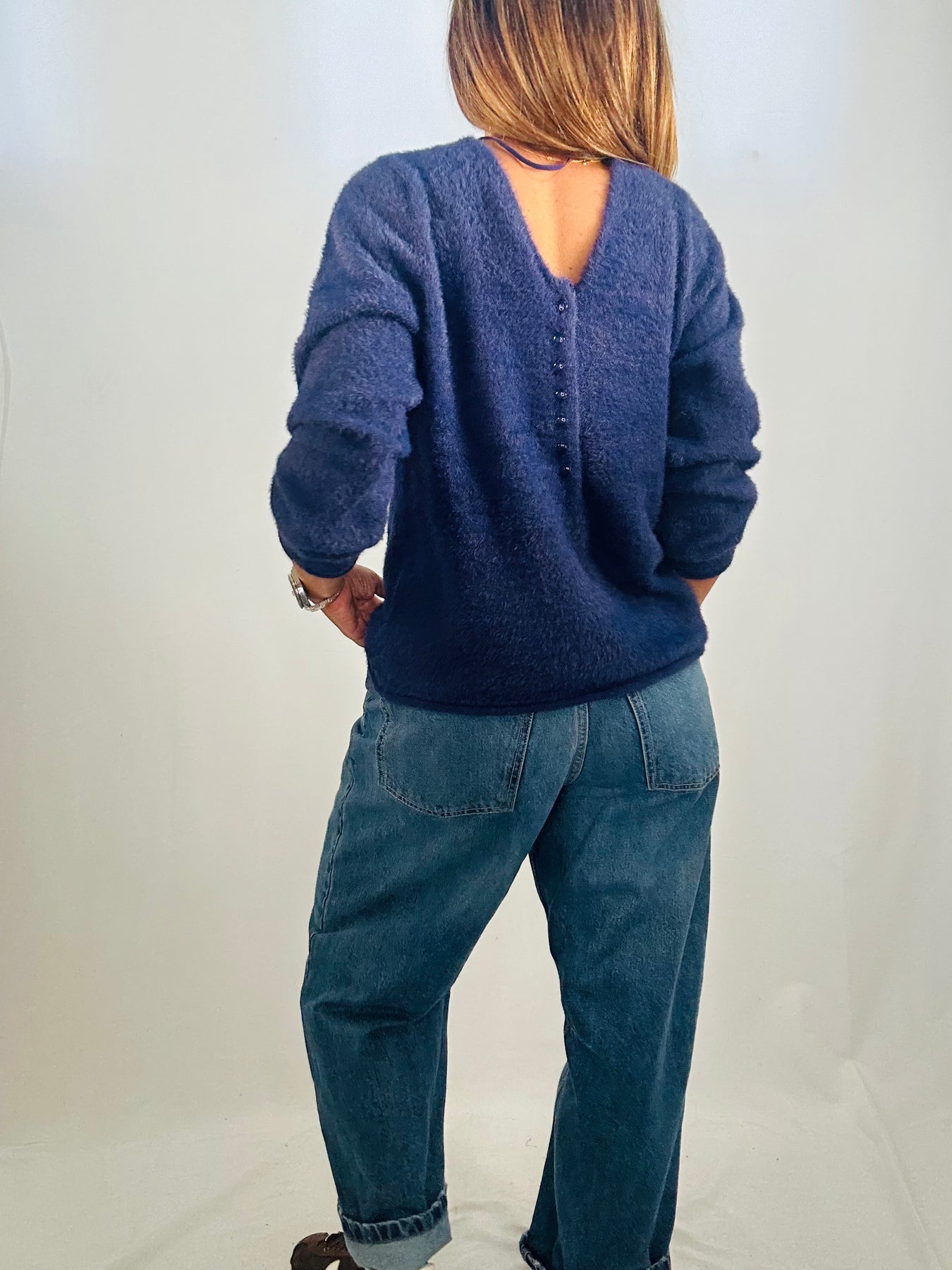 Relaxed fit, true to size, long sleeves, super soft knit, round wide neckline on one side and v neckline with delicate buttons on the other, reversible.