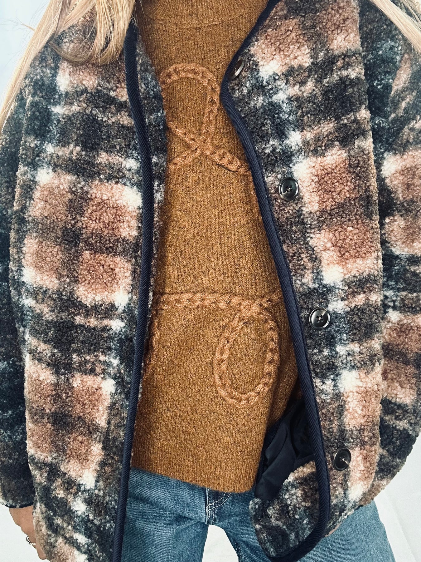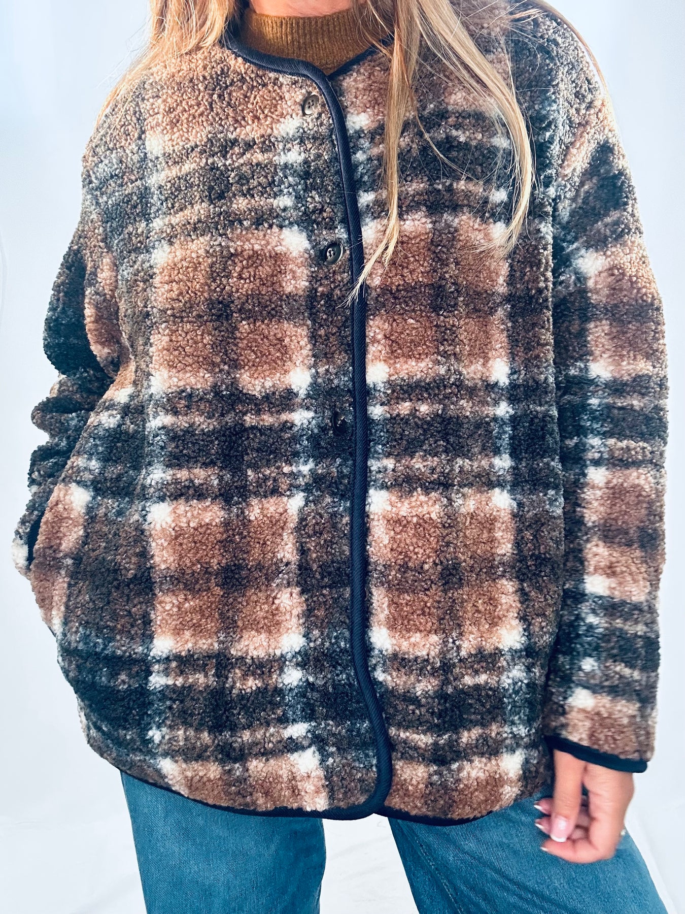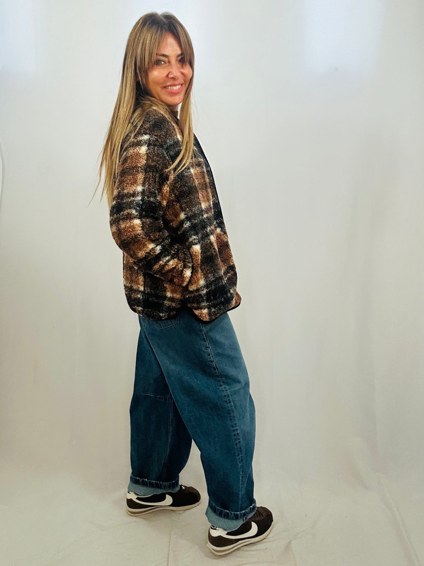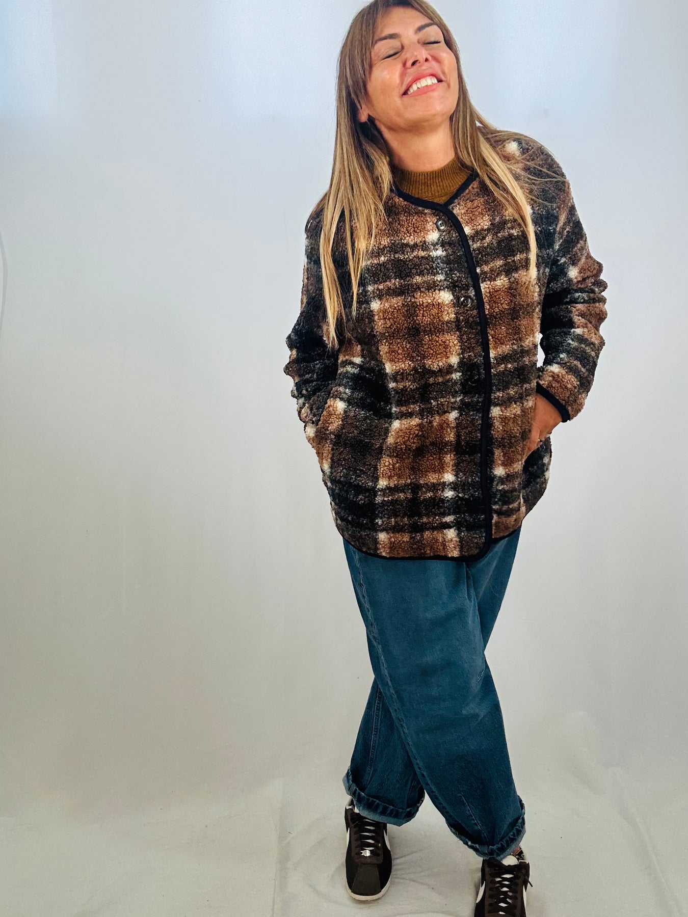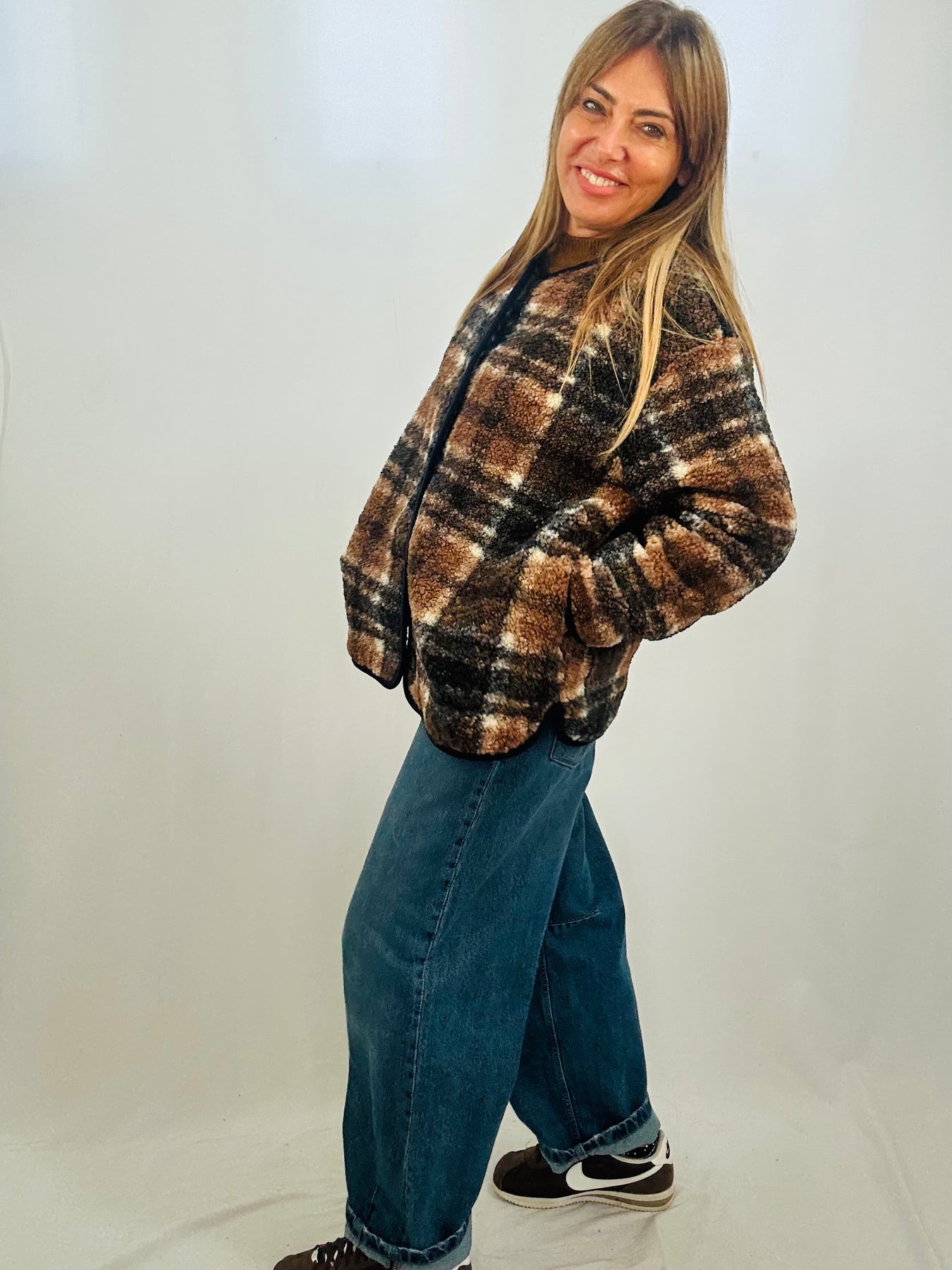 The Lela Check Fleece combines classic style with cozy comfort. Its oversized fit ensures a relaxed silhouette, while the buttoned front allows for easy layering. Designed with a stylish check pattern and practical side pockets, this fleece jacket is perfect for keeping warm without sacrificing fashion. Make it your go-to piece for effortless everyday wear.