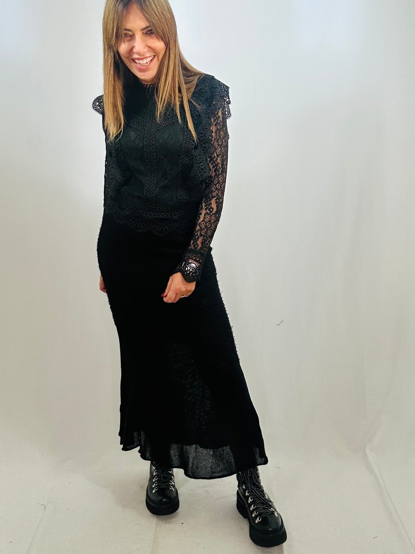 The Mona knit maxi skirt combines stretch and softness for ultimate comfort. Crafted from delicate fine yarns, it features a unique design with a subtly tufted knit top section and a smooth knit bottom. The elasticated waistband ensures a gentle fit, making it perfect for pairing with boots and a blouse or a sleek knit for an effortlessly sophisticated look.