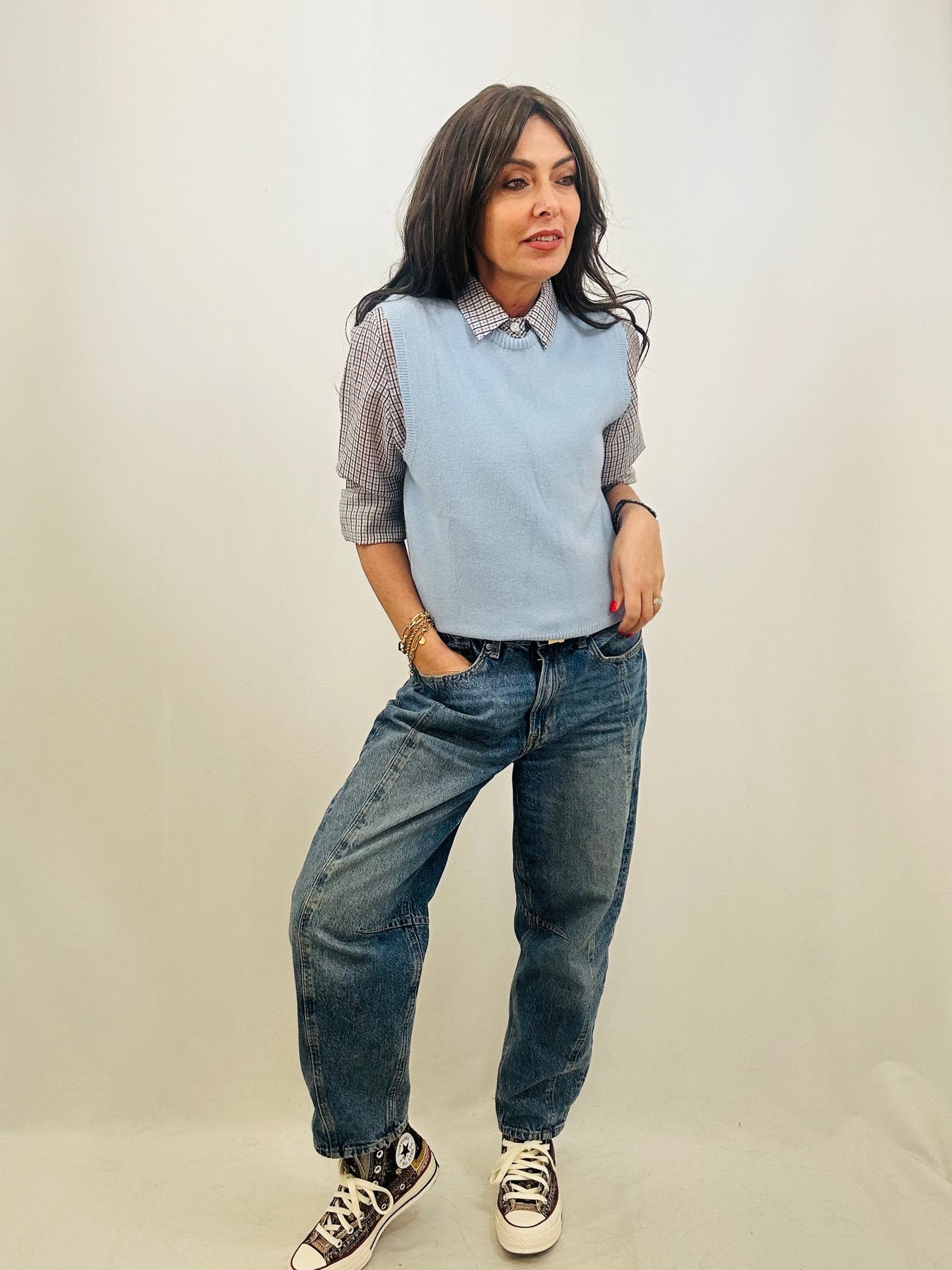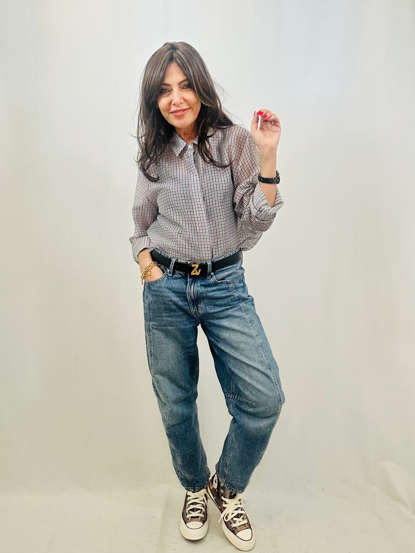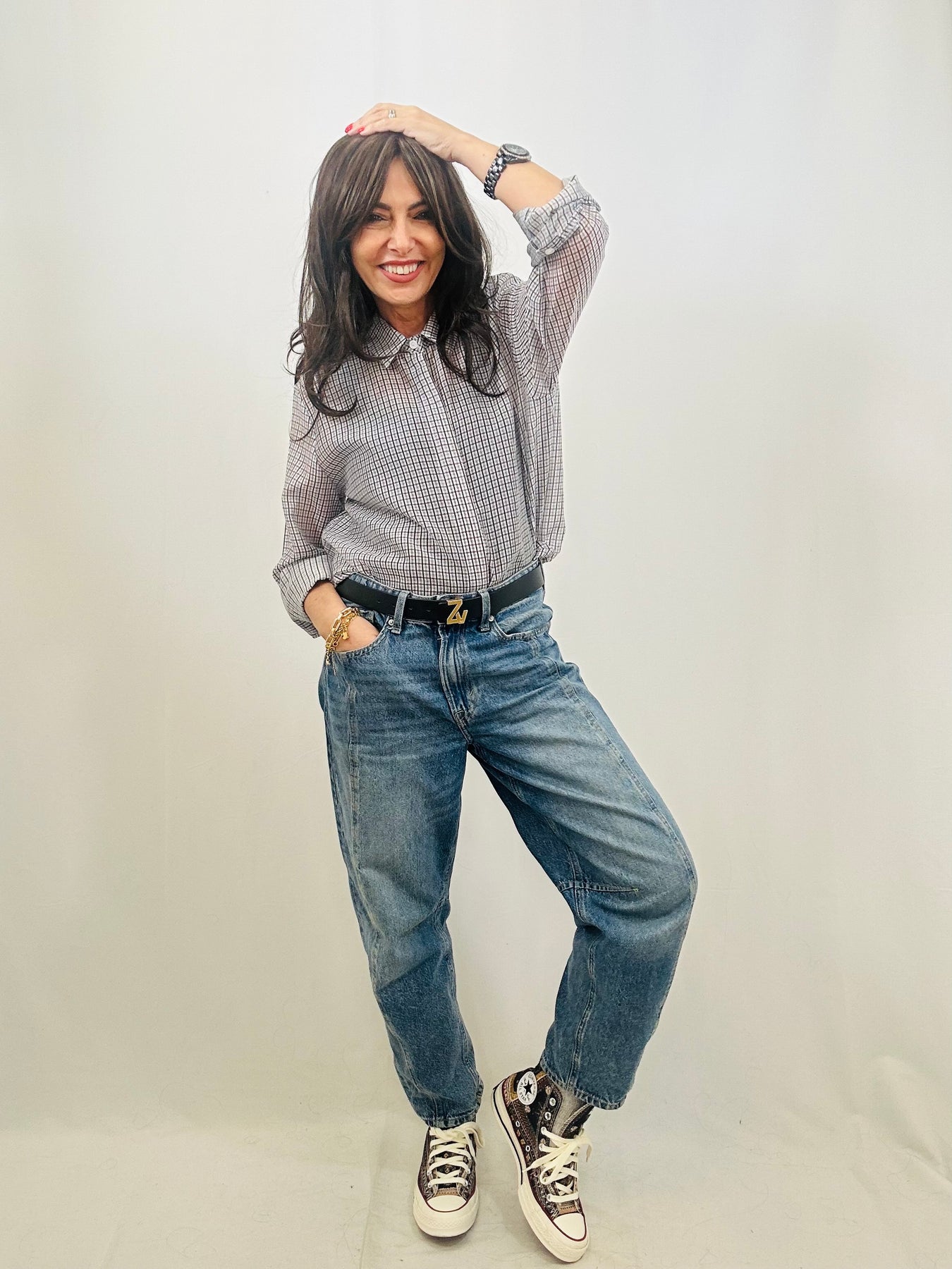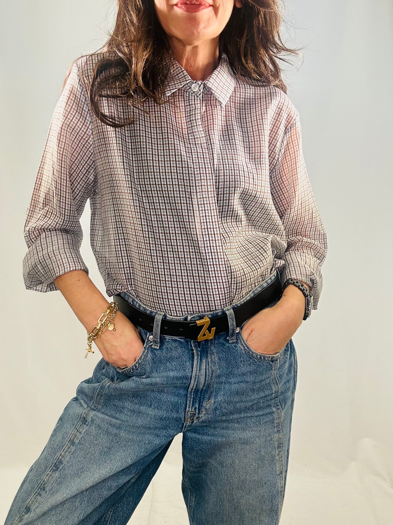 A modern take on a classic staple, the Chloe shirt combines refined tailoring with contemporary flair. Its sheer checked fabric creates subtle depth and visual texture, while the structured collar and button-up front deliver timeless appeal. Finished with neat cuffs for a put-together feel, this piece transitions effortlessly from boardroom to weekend. Style it with tailored trousers for understated elegance or throw it over a tee with jeans for relaxed sophistication.