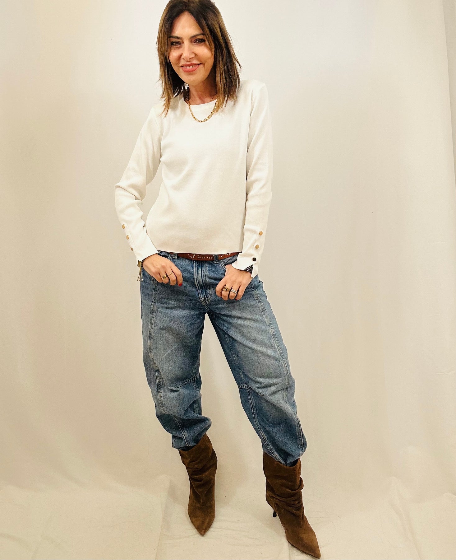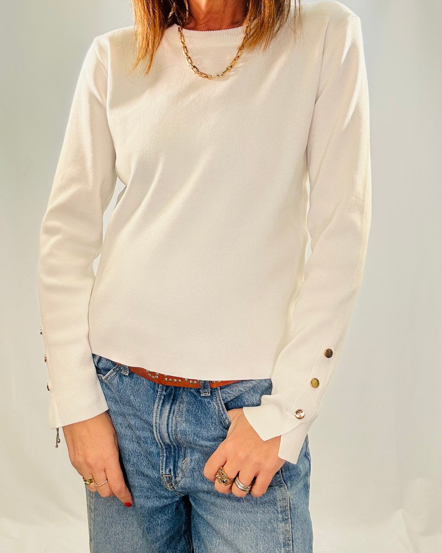 The Clara button sleeve jumper features a round neck and long sleeves adorned with gold button details at the cuffs. Its neat fit and classic design make it an essential wardrobe staple, suitable for various occasions. The blend of style and versatility enhances outfit coordination and elevates sophistication.
