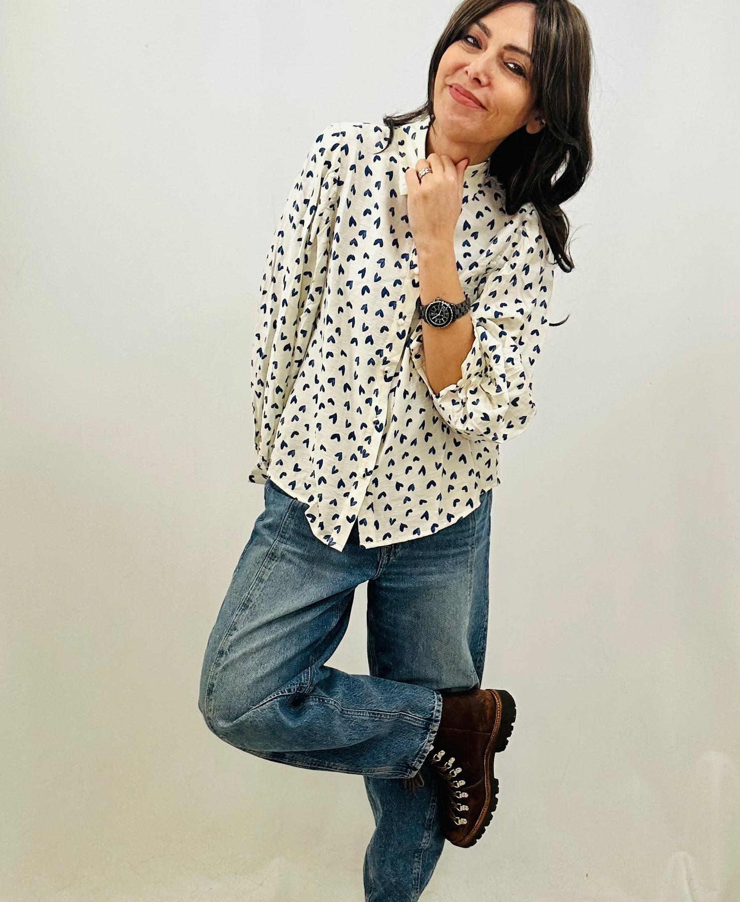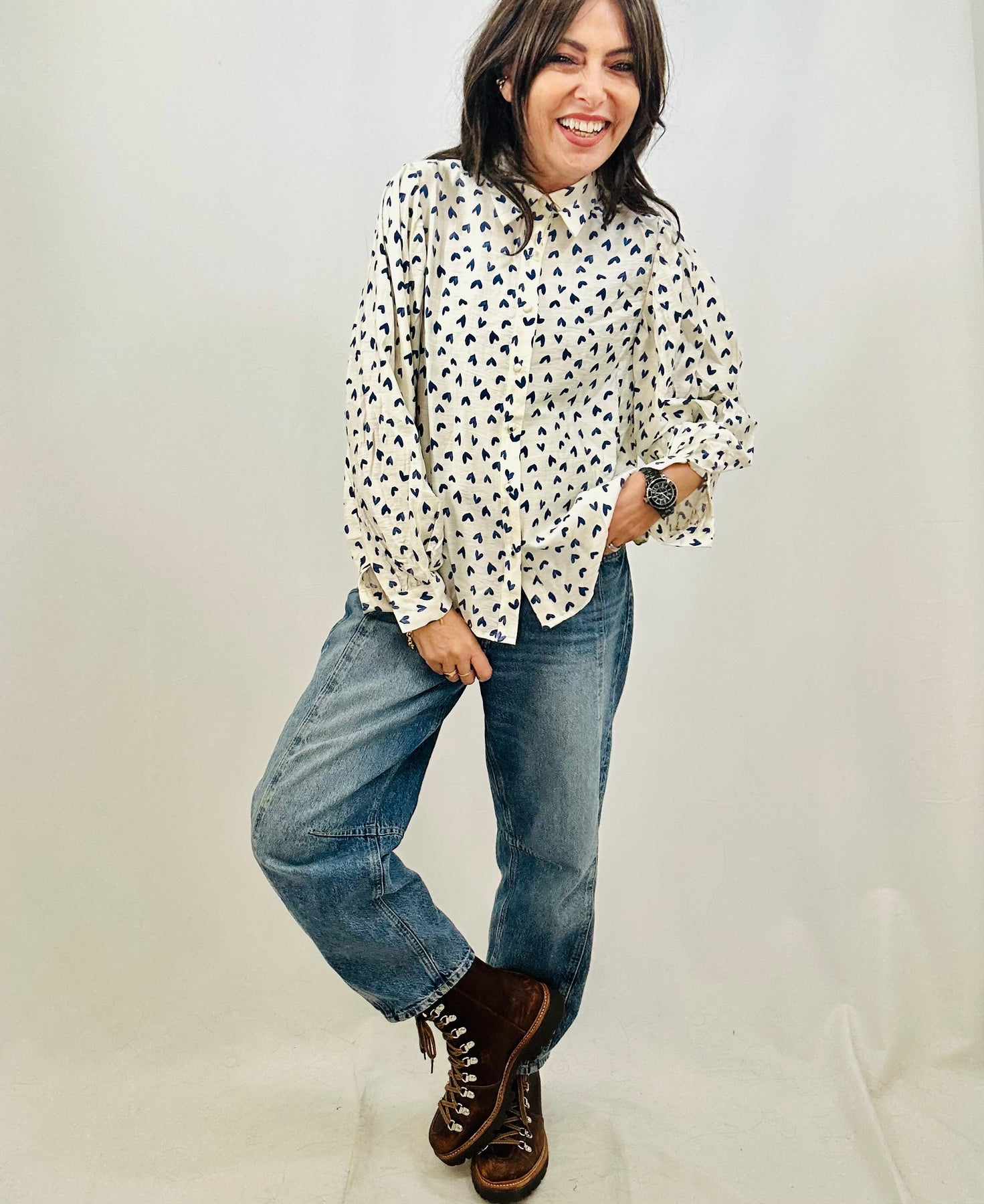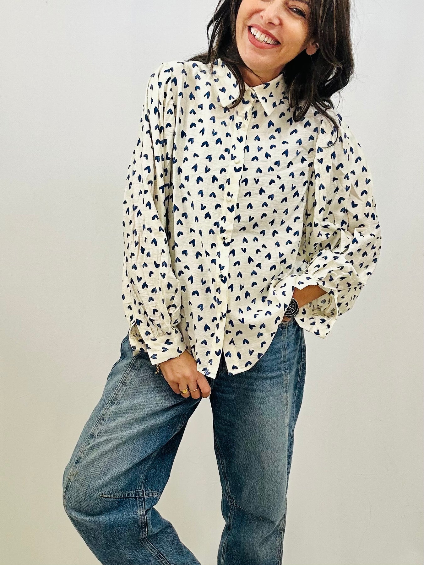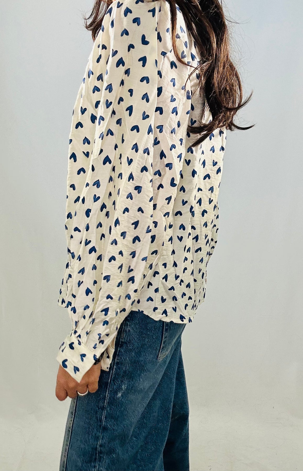 Adorable heart print meets effortless cool in this charming shirt. Featuring a classic collar, button-front closure, and finished cuffs, it's the perfect layering piece that pairs beautifully with your favourite denim. Fresh, fun, and endlessly versatile—throw it on and feel instantly put-together.