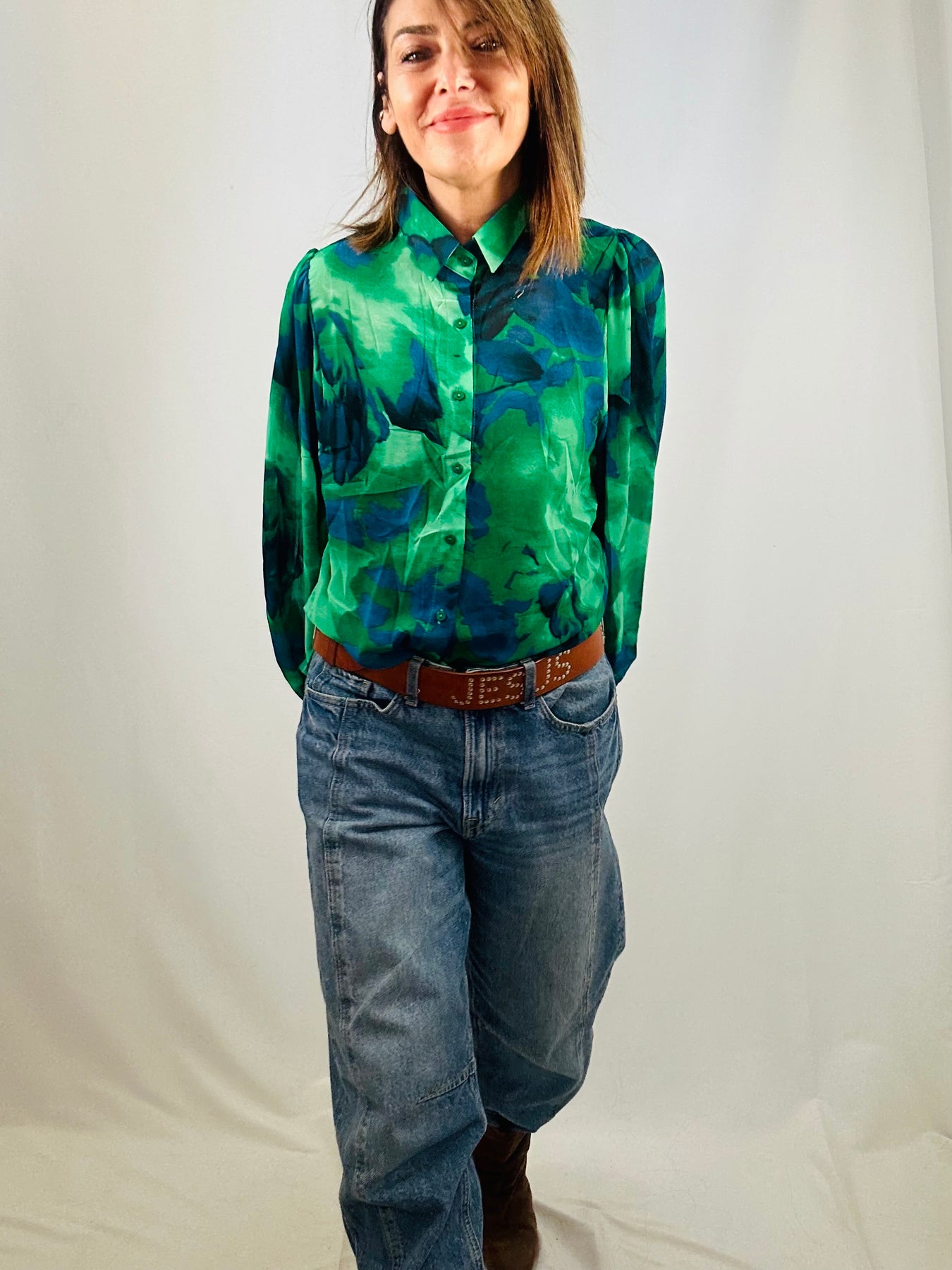 The Orla sheer abstract shirt features a lightweight, sheer fabric with a striking abstract pattern and bold colorway. Its long blouson sleeves and structured collar provide a sophisticated silhouette. Ideal for layering or as a statement piece.