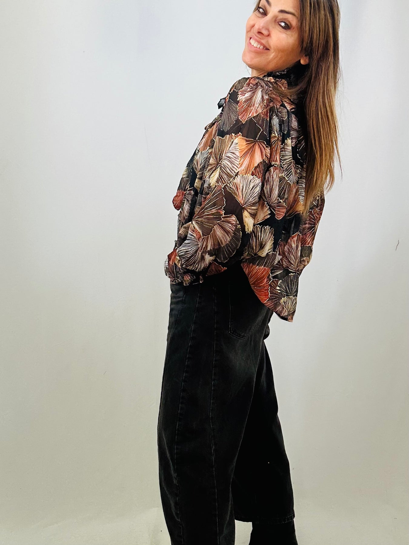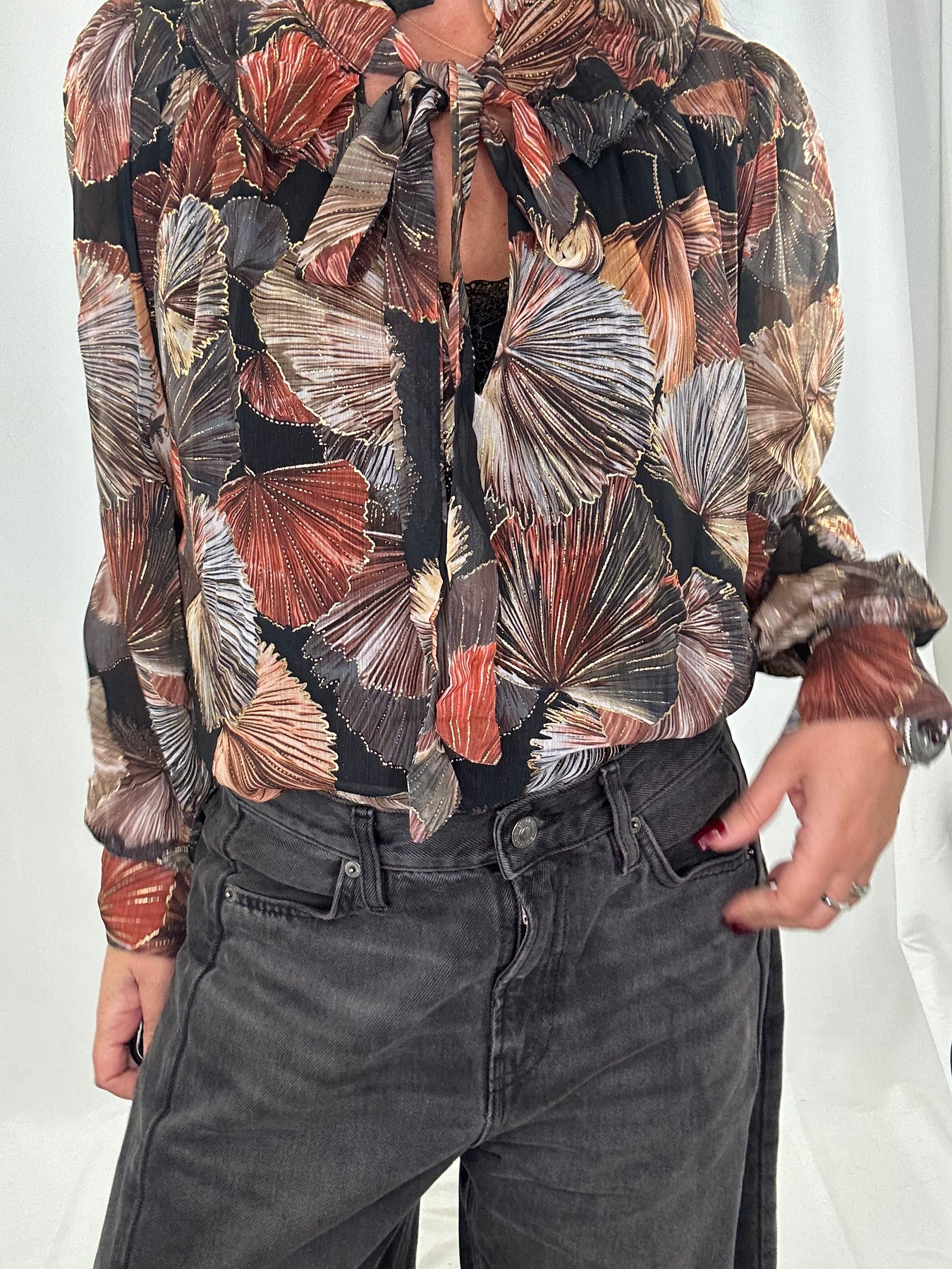 Discover understated elegance with the Rosine frill neck blouse. This chiffon piece showcases a colourful palette enhanced by subtle gold detailing, paired with a graceful frilled neckline and tie closure. Long sleeves with refined cuffs and a lined body complete this timeless wardrobe essential.