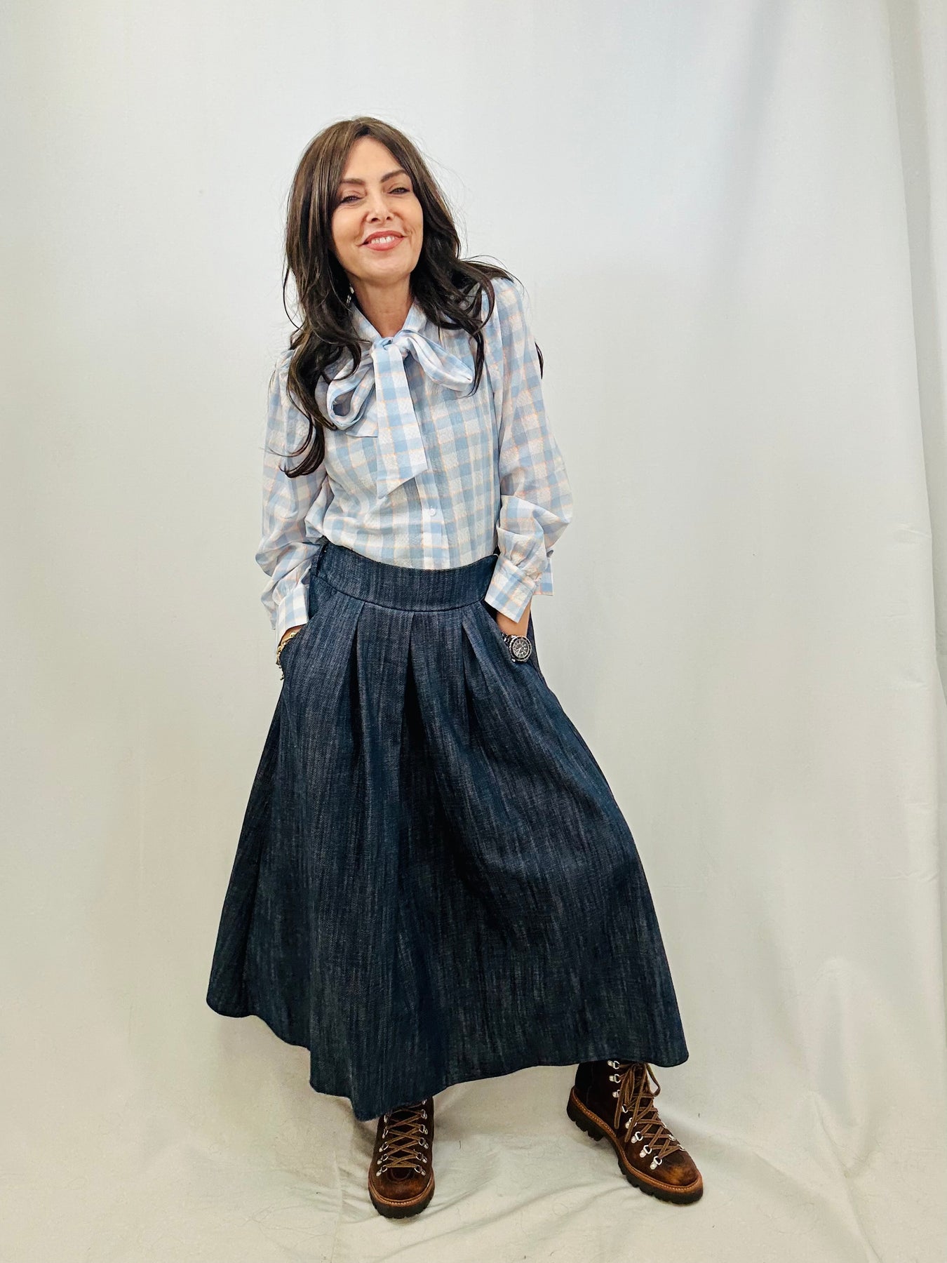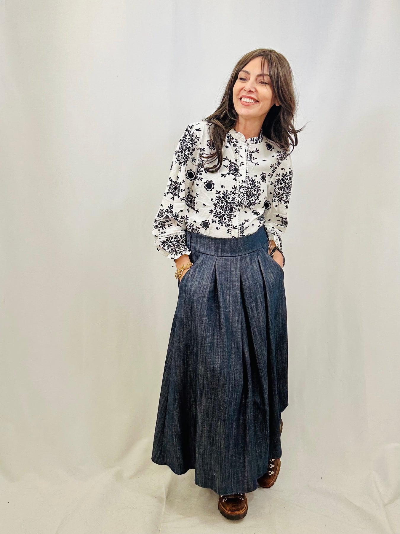 The Cameron denim midaxi skirt combines comfort and versatility through its elasticated back waist and practical side pockets. Featuring wide pleats, it offers a stylish alternative to jeans, making it suitable for various occasions. This skirt can be effortlessly paired with shirts, tees, or jumpers for a polished look.