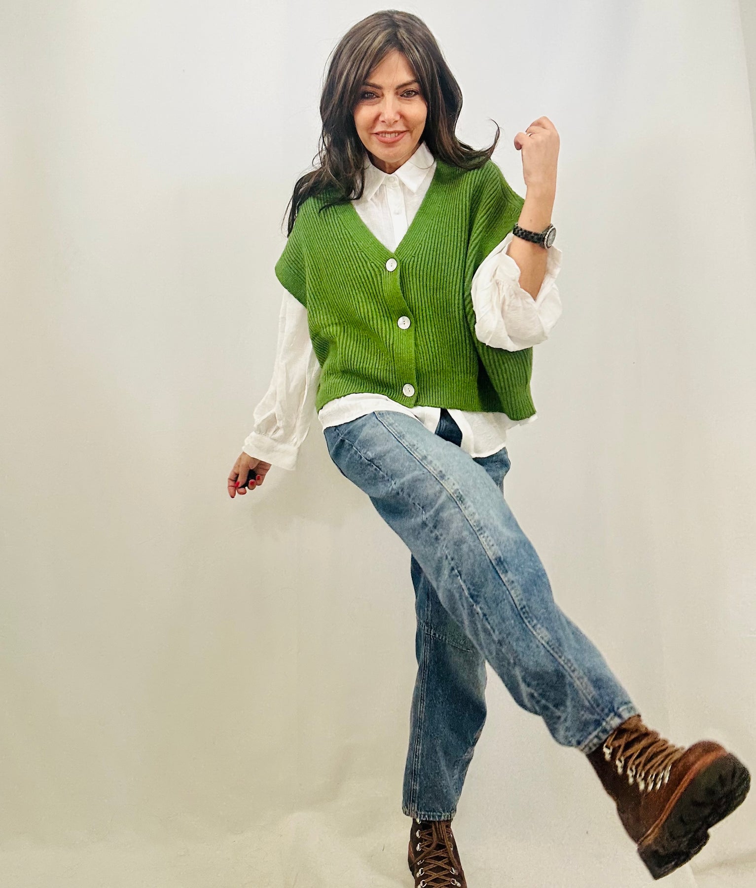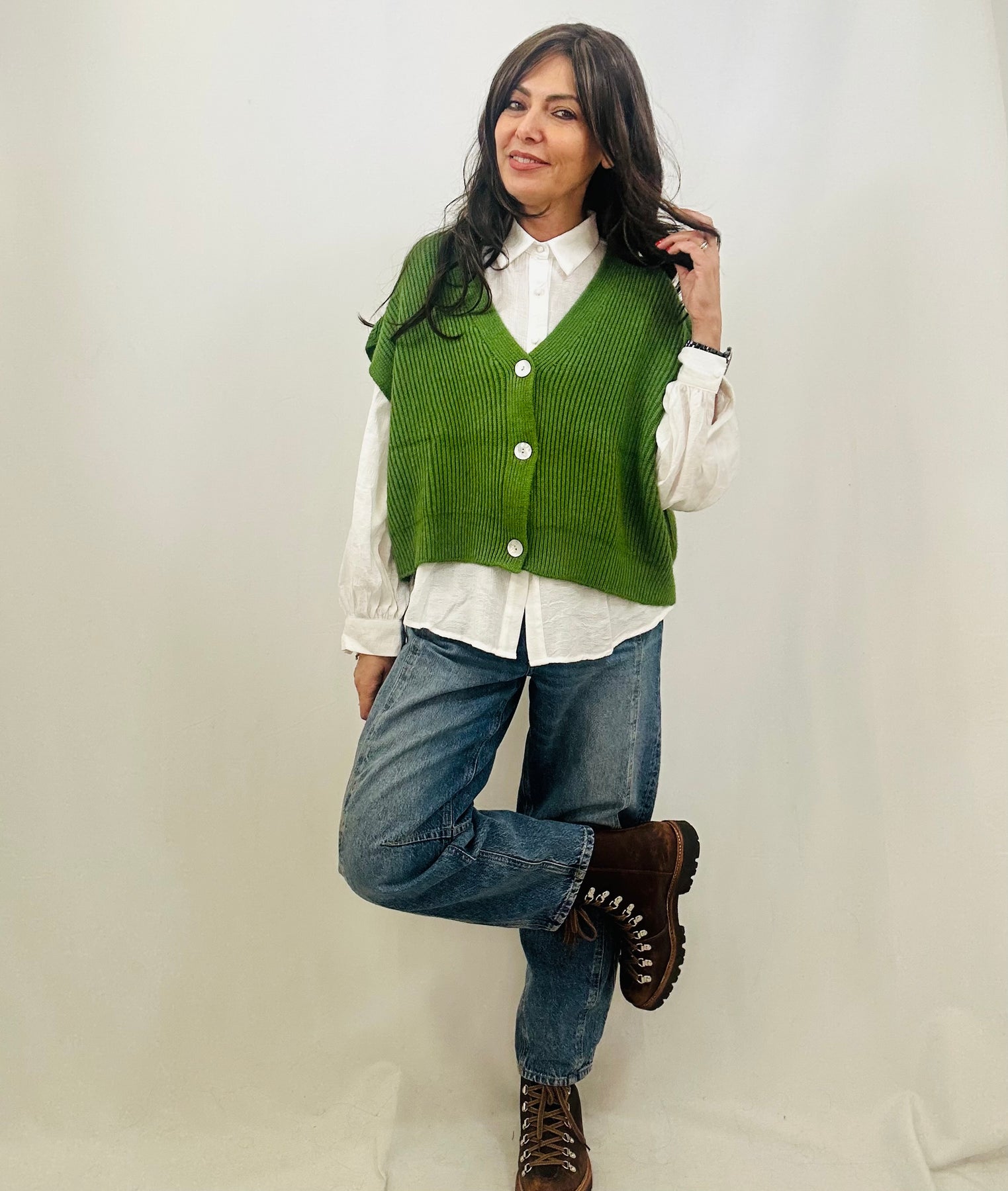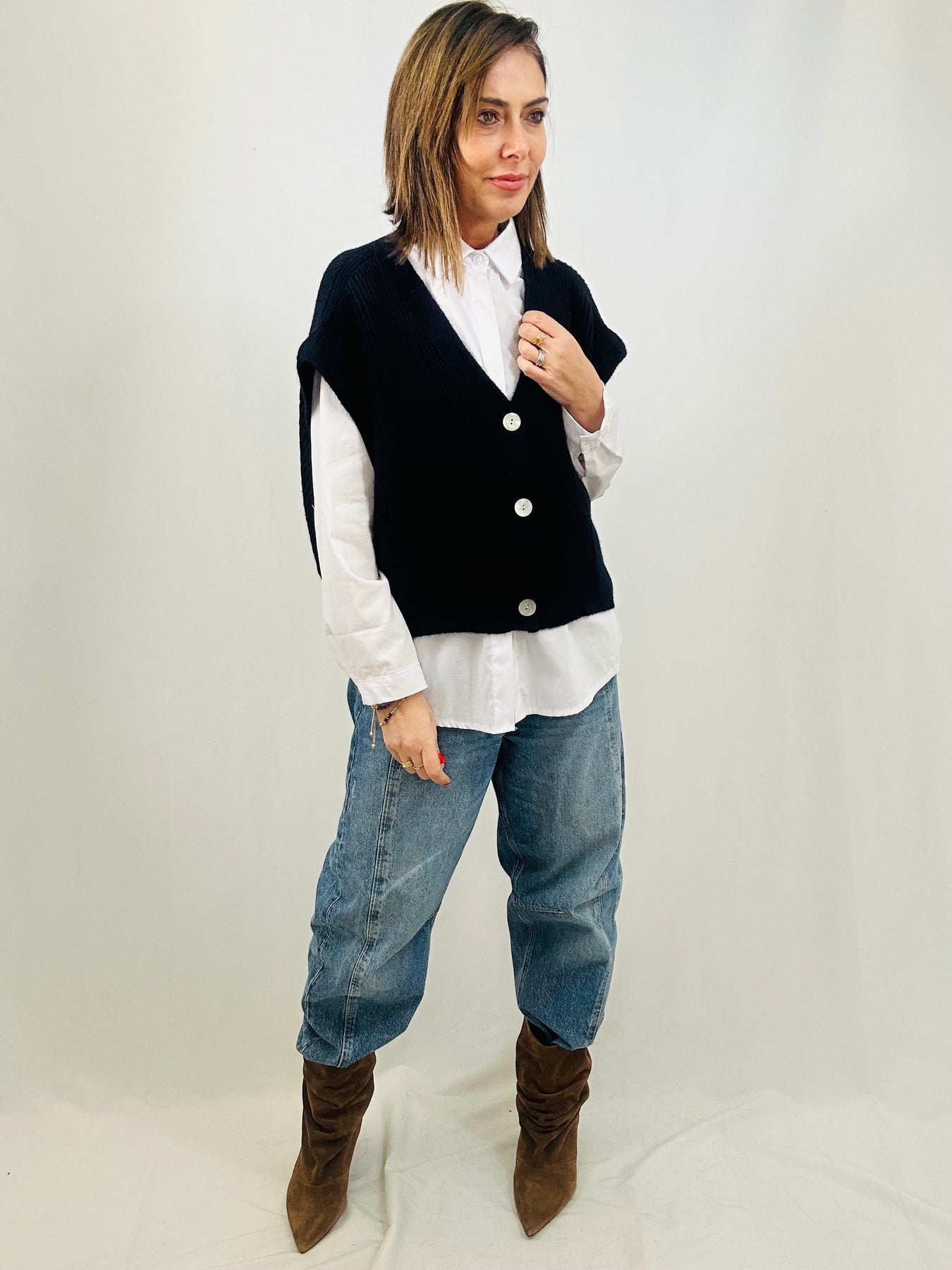 Your wardrobe's new best friend just arrived. Crafted from chunky rib knit, this boxy tank features a deep V-neck and three functional buttons that elevate the everyday. The sleeveless, slouchy design is pure versatility—layer it over basics, slip it under oversized pieces, or let it shine on its own. It's the kind of piece that plays well with everything.