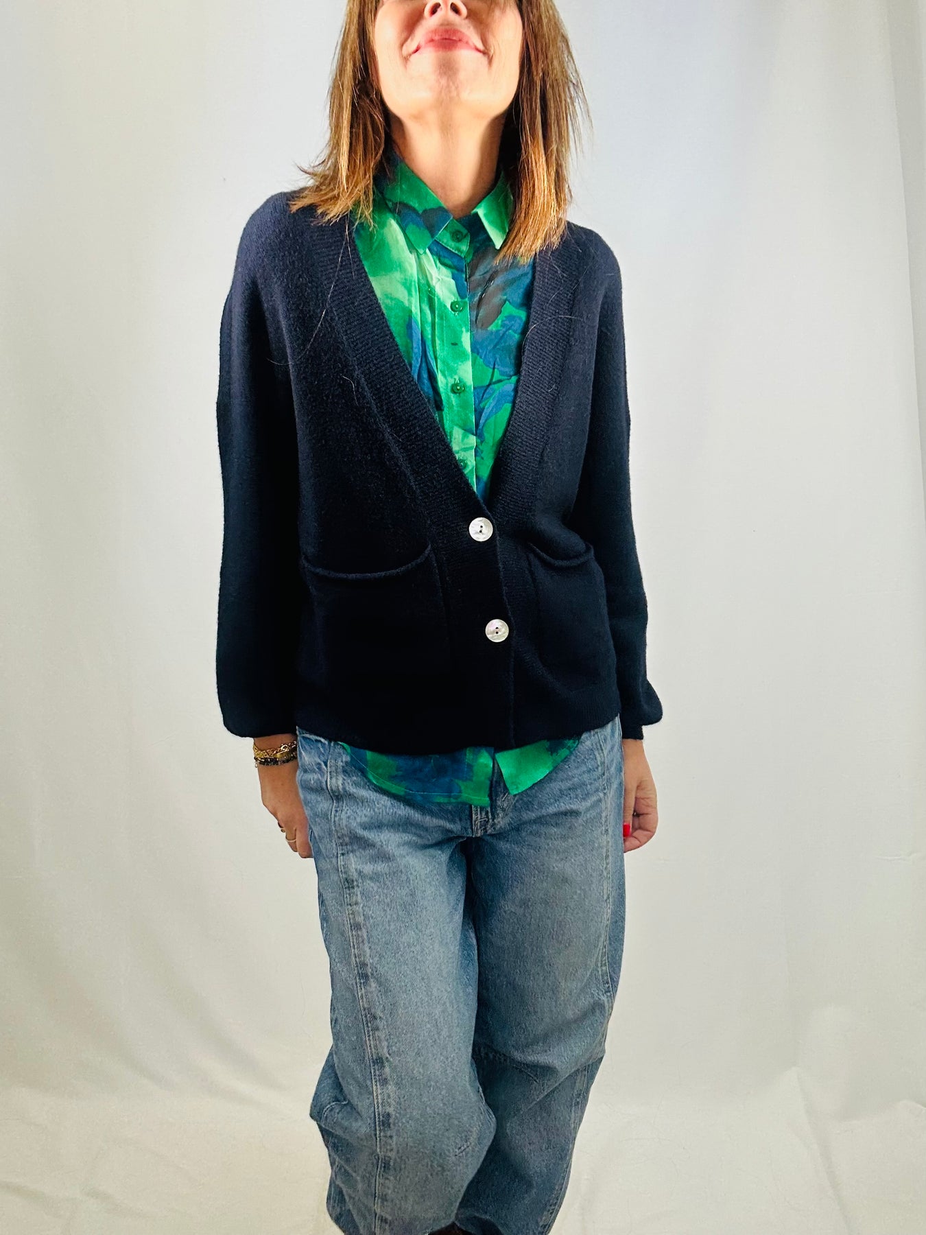 Boxy cut, v-neck, long sleeves, two pockets, two buttons, slouchy, roomy fit.