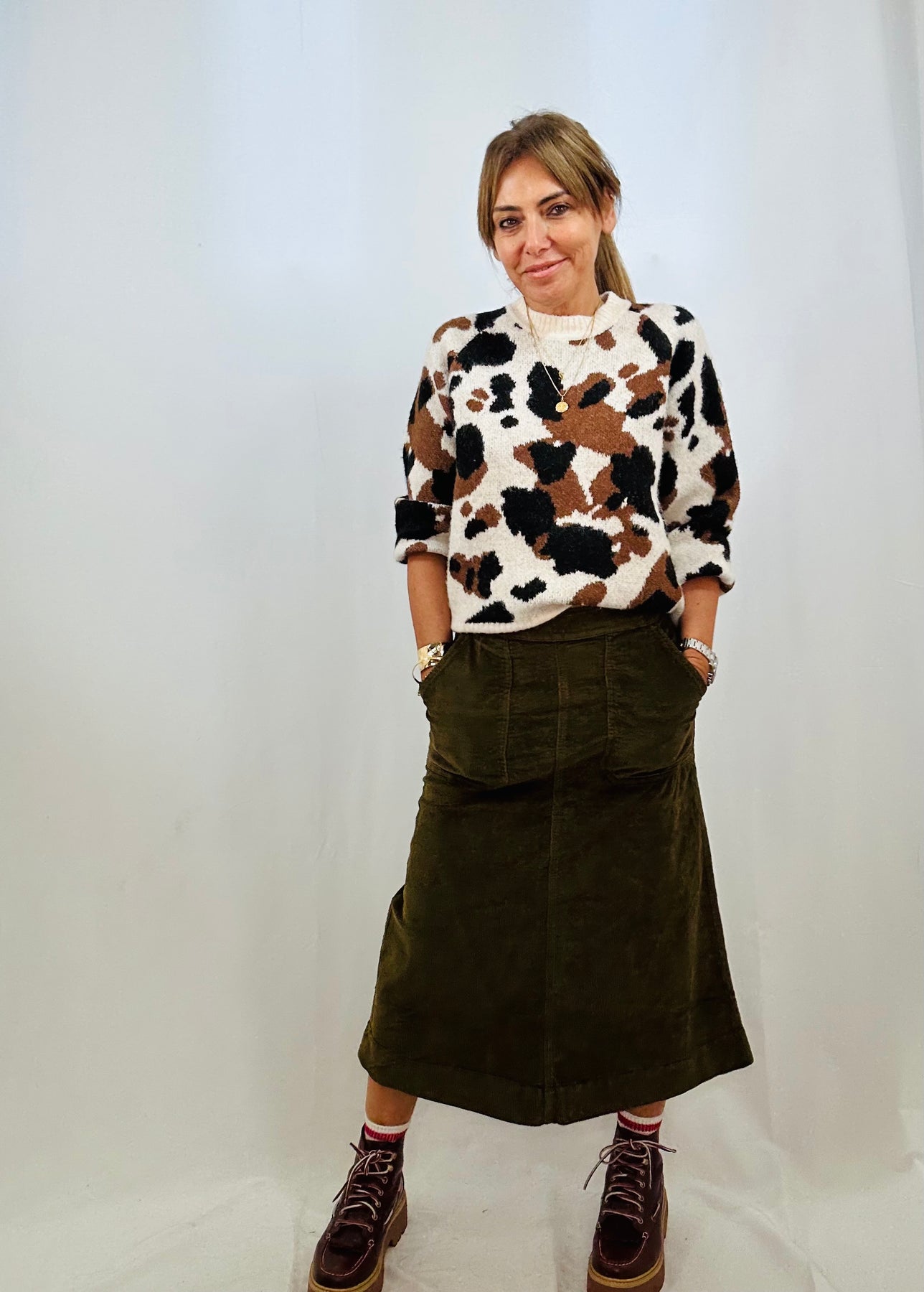 This smart cord skirt features a flattering slight A-line silhouette and a versatile midaxi length, perfect for both casual and polished looks. Equipped with practical front pockets, it combines style with function effortlessly. Elevate your wardrobe with this cool, comfortable piece that transitions seamlessly from day to night.